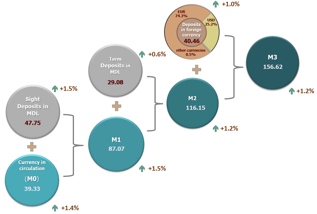 5. Money supply M2 includes money aggregate (M1), term deposits in Moldovan lei of residents and money market instruments.