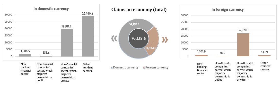 10. Claims on domestic economy represent claims of the banking system of the Republic of Moldova (including banks in the process of liquidation), in domestic and in foreign currencies, on non-financial commercial companies, which majority ownership is public or private, on other resident sectors. This indicator includes loans and borrowings (including overdue debt), overdue interest on loans; debt securities and shares; other claims.