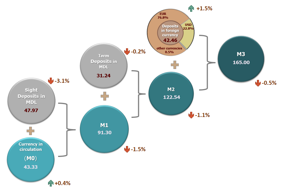5. Money supply M2 includes money aggregate (M1), term deposits in Moldovan lei of residents and money market instruments.