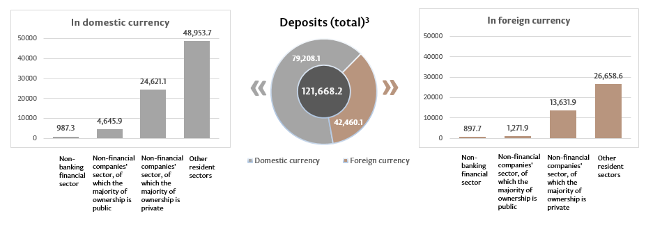 The balance of deposits in domestic currency decreased by MDL 1,577.5 million compared to the previous month and amounted to MDL 79,208.1 million, representing a share of 65.1% of the total balance of deposits. At the same time, the balance of deposits in foreign currency (recalculated in MDL) increased by MDL 607.6 million to MDL 42,460.1 million, as compared to the previous month, having a share of 34.9% (Chart 3).