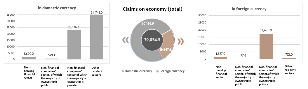 10. Claims on domestic economy represent claims of the banking system of the Republic of Moldova (including banks in the process of liquidation), in domestic and in foreign currencies, on non-financial commercial companies which majority ownership is public or private, on other resident sectors. This indicator includes loans and borrowings (including overdue debt), overdue interest on loans; debt securities and shares; other claims.