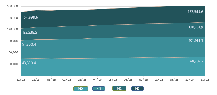 Money supply M25 amounted to MDL 138,331.9 million, increasing by 0.8% compared to October 2025 and by 12.9% compared to the same period of the previous year (Chart 2).