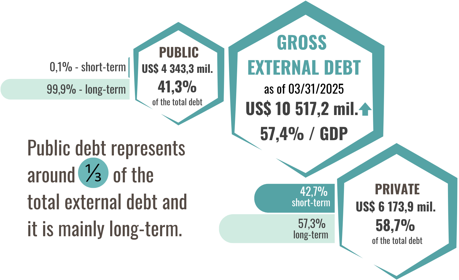 The public external debt accounted for 41,3% of the total external debt and totalled US$ 4 343,26 million (+0,8% as compared to the end of the previous year). The private external debt amounted to US$ 6 173,89 million and increased by 4,6% as compared to 12/31/2024.