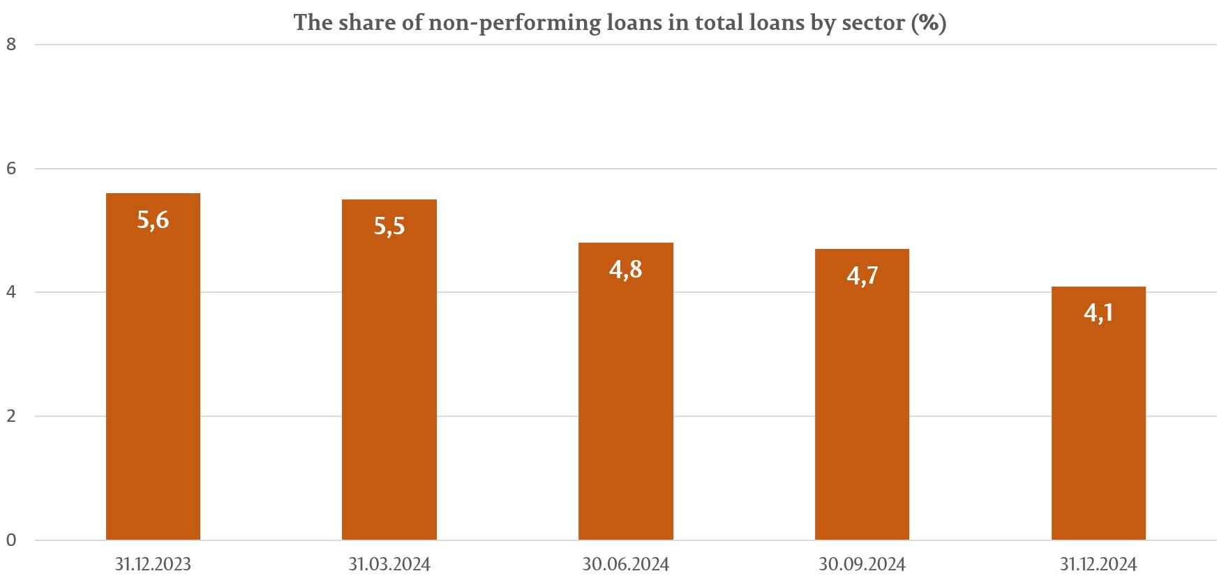 During the reference period, the share of non-performing loans (substandard, doubtful and compromised) in total loans decreased by 1,4 p.p. accounting for 4,1% as of 31 December 2024, with the indicator ranging from 2,6% to 10,8%, depending on the bank.