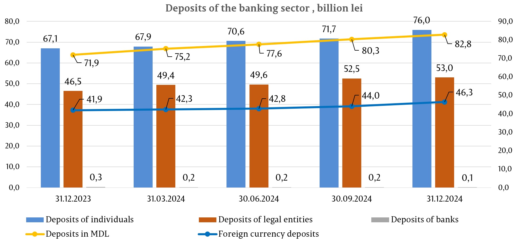 Of the total deposits, 64,1% were deposits in MDL, the balance increased by MDL 10 870,2 million (15,1%) compared to the end of the previous year and amounted to MDL 82 767,8 million as of 31 December 2024. Deposits in foreign currency accounted for 35,9% of total deposits, their balance increased during the reporting period by MDL 4 374,8 million (10,4%), amounting to MDL 46 323,9 million.