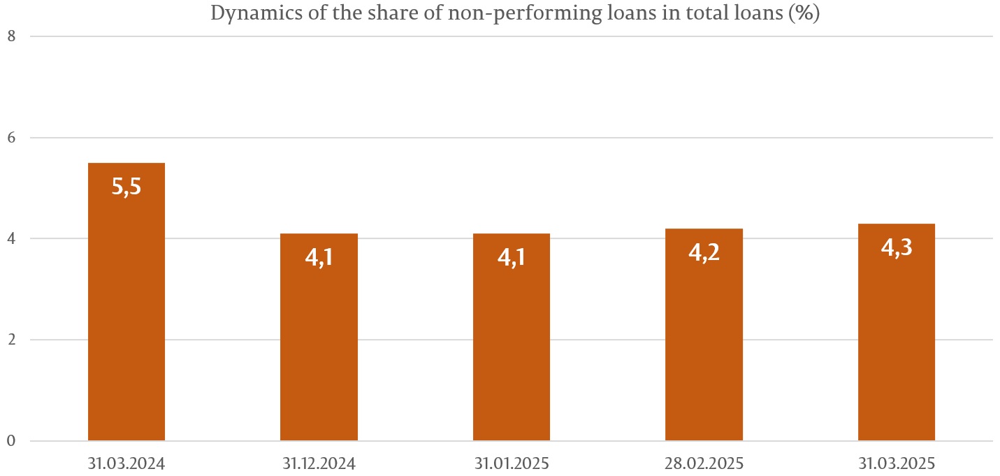 During the reference period, the share of non-performing loans (substandard, doubtful, and compromised) in total loans increased by 0.2 percentage points, reaching 4.3% as of 31 March 2025, with the indicator ranging from 3.1% to 8.1%, depending on the bank.