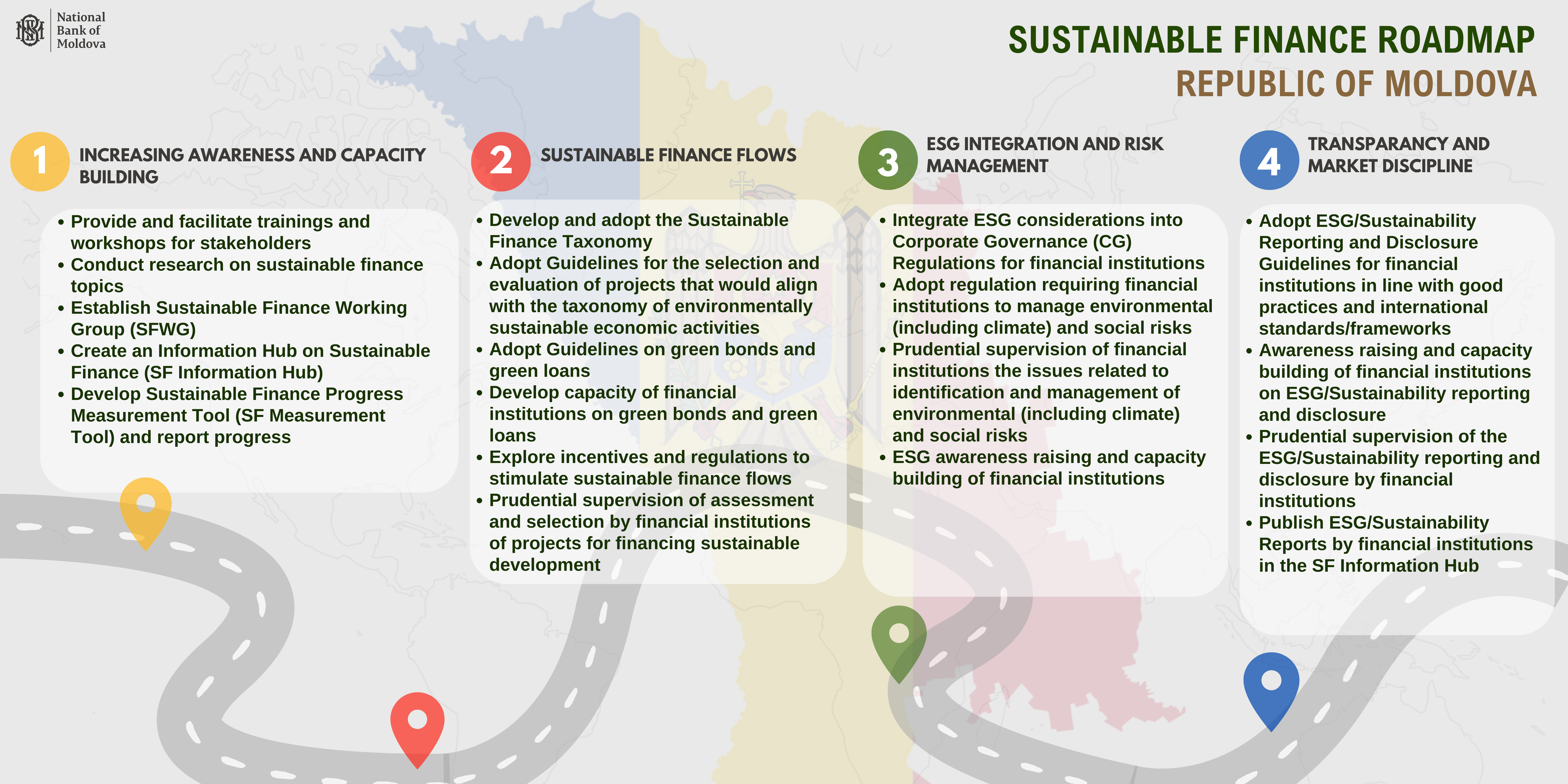 The Roadmap consists of the four main pillars, under which concrete actions and measures are planned to be implemented according to the Action Plan for the Development of Sustainable Finance in the Republic of Moldova 2024-2028.