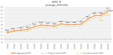 The RPPI associated to the new dwellings listed on the primary market has registered the value of 183.1 percent, that is a 4.1 percent increase compared to the 3rd quarter of 2024, and a 19.4 percent increase compared to the 4th quarter of 2023.