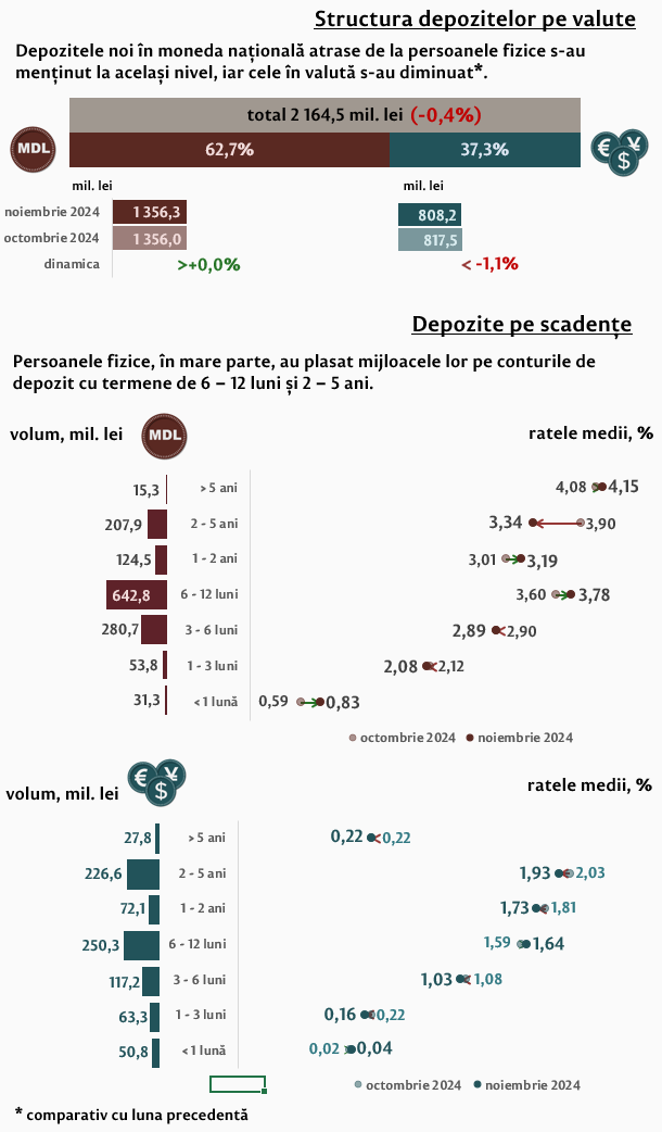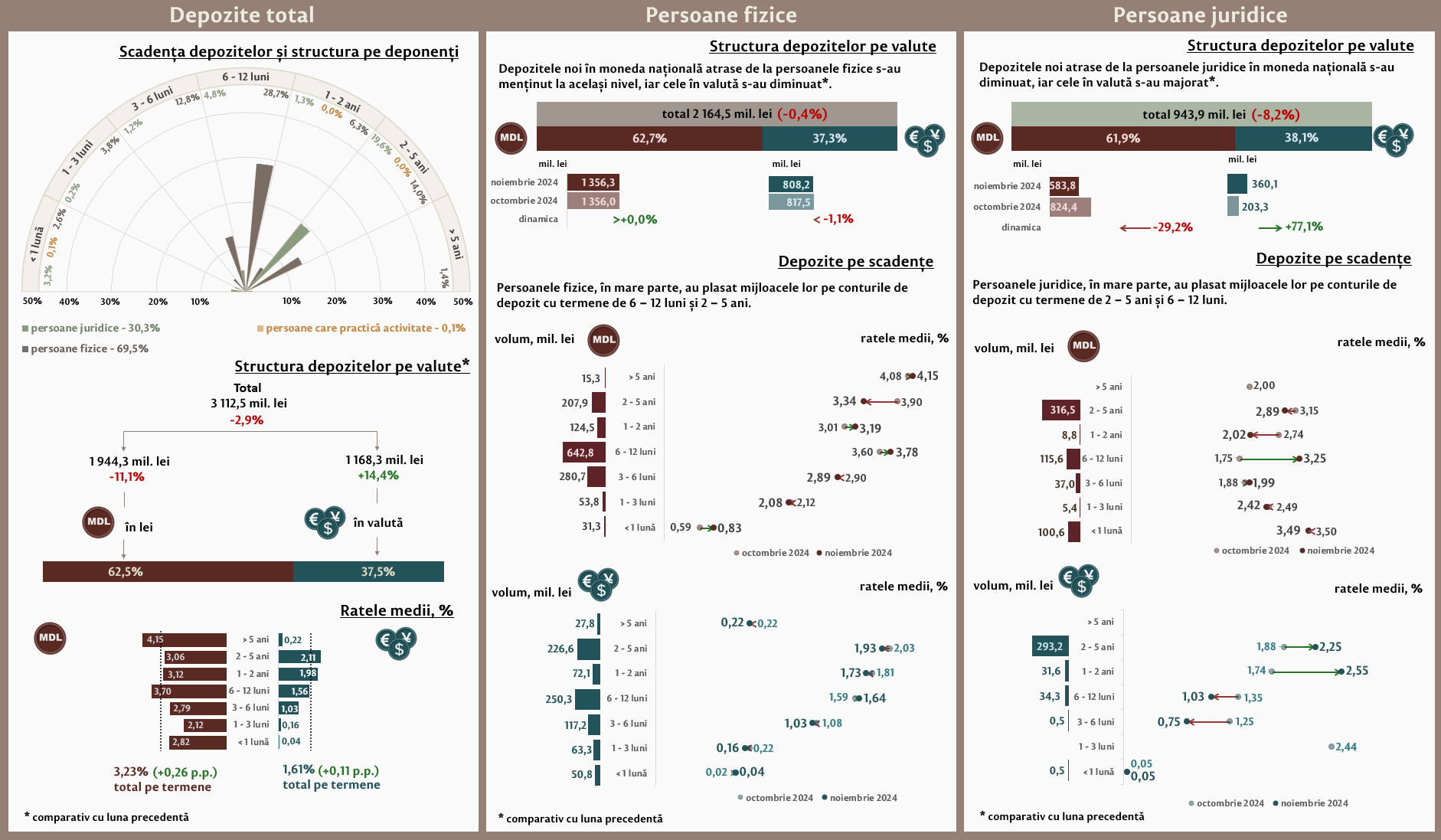 În luna noiembrie 2024, depozitele noi1 atrase la termen (Infografic 1) au constituit 3 112,5 milioane lei, micșorându-se cu 2,9 la sută față de luna octombrie 2024. Depozitele atrase în moneda națională au înregistrat o pondere de 62,5 la sută și au însumat 1 944,3 milioane lei, fiind în descreștere cu 11,1 la sută față de luna precedentă. Depozitele atrase în valută au totalizat 1 168,3 milioane lei, înregistrând o creștere cu 14,4 la sută față de luna precedentă.