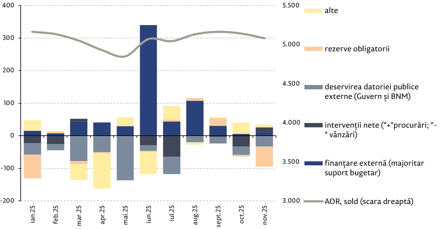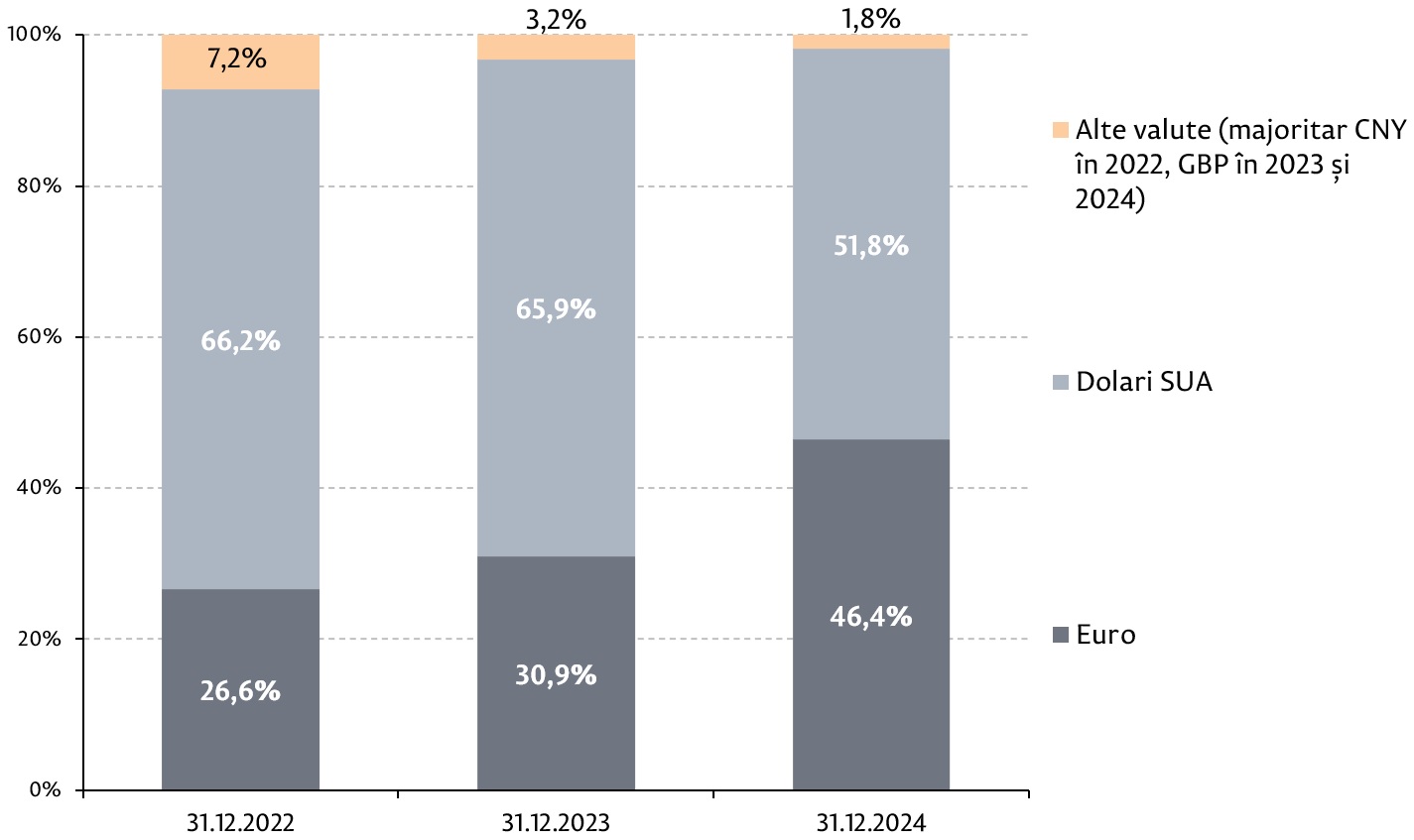 Rezervele valutare la nivel global sunt investite, în principal, în active financiare denominate în dolari SUA, în timp ce euro este a doua cea mai utilizată monedă de rezervă. În cazul Republicii Moldova, contextul economic impune necesitatea menținerii unei cote mai mari comparativ cu media globală a rezervelor internaționale investite în instrumente denominate în euro. Cota monedei unice europene în rezerve a fost în creștere în ultimii ani, euro devenind valuta principală în structura valutară a rezervelor internaționale în 2025. Intensificarea relațiilor cu UE, precum și a schimburilor în euro cu țările membre au sporit esențial importanța euro pentru economia Republicii Moldova. În context, BNM a decis, ca începând cu 2 ianuarie 2025, euro să fie utilizată ca monedă de referință pentru stabilirea cursului oficial al leului moldovenesc. Pe fondul accentuării rolului dominant al monedei euro în structura valutară a importurilor și a datoriei externe, al deciziei de modificare a valutei de referință și de intervenție, s-a considerat oportună recalibrarea structurii valutare a rezervelor internaționale în scopul asigurării unei cote de cel puțin 50 la sută acestei valute. În acest sens, a fost aprobată o nouă modalitate de stabilire a structurii valutare normative, prin aprobarea unor benzi de deviere a cotei valutelor, fiind încadrate în intervale admisibile de variație: euro – între 50 la sută și 70 la sută, dolarul SUA – între 25 la sută și 50 la sută, alte valute – maxim 10 la sută din rezerve. Tranziția la noua structură valutară a fost asigurată până la 31 martie 2025.