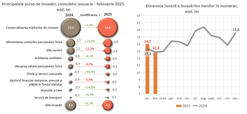 În ianuarie–februarie 2025, volumul încasărilor cumulative de numerar în casele băncilor a depășit cu 50,9 mil. lei volumul eliberărilor cumulative de numerar pe sistemul bancar1.