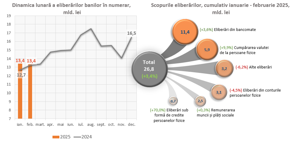 Totodată, în ianuarie-februarie 2025, au fost înregistrate diminuări ale eliberărilor în alte scopuri cu 212,5 mil. lei (-6,2 la sută) și a eliberărilor din conturile persoanelor fizice cu 145,3 mil. lei (-4,5 la sută).