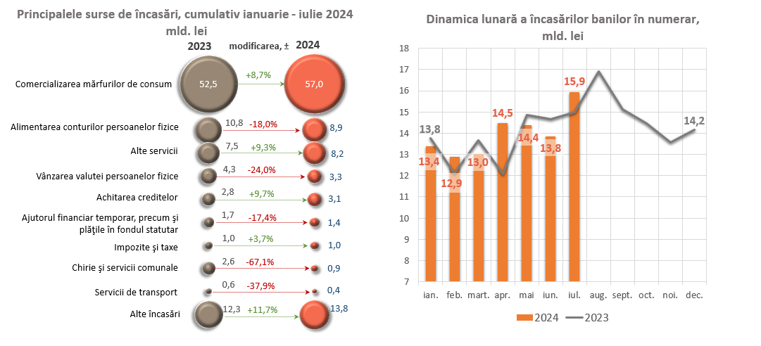 În perioada de referință, volumul încasărilor cumulative de numerar s-a majorat cu 1 765,8 mil. lei (+1,8 la sută) față de perioada similară a anului precedent și a constituit 97 901,1 mil. lei.