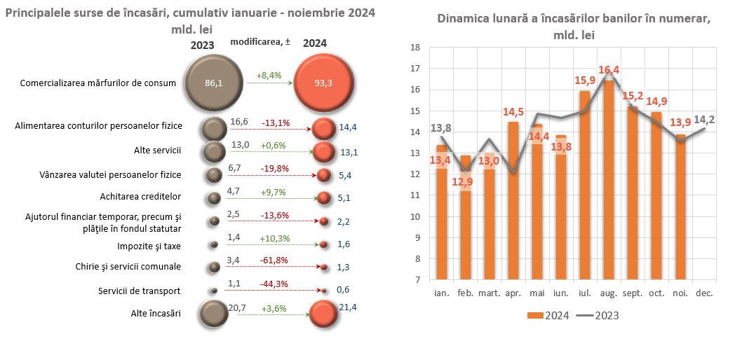 În ianuarie – noiembrie 2024, volumul eliberărilor cumulative de numerar din casele băncilor a depășit cu 4 776,4 mil. lei volumul încasărilor cumulative de numerar pe sistemul bancar1.