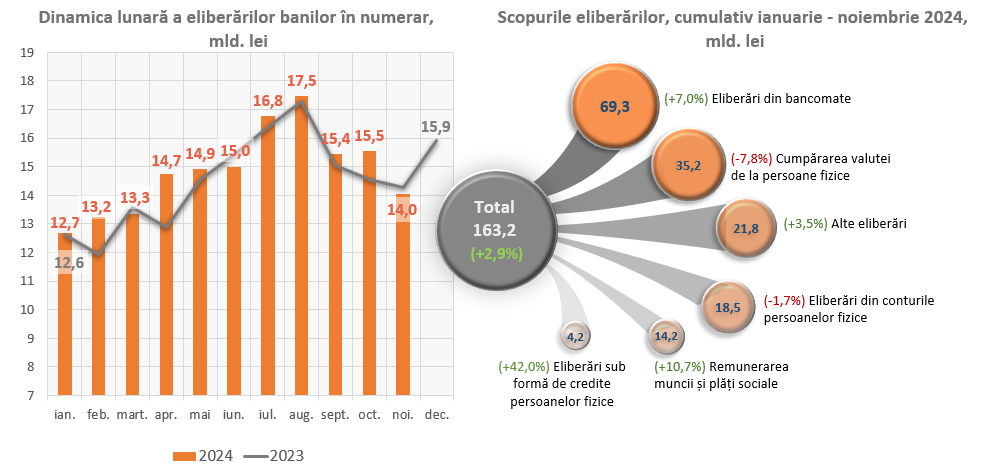 Un impact major asupra dinamicii eliberărilor de numerar din casele băncilor au avut, pe de o parte, majorarea eliberărilor din bancomate cu 4 520,2 mil. lei (+7,0 la sută), a eliberărilor pentru remunerarea muncii și plăți sociale cu 1 371,1 mil. lei (+10,7 la sută), a eliberărilor sub forma de credite persoanelor fizice cu 1 239,6 mil. lei (+42,0 la sută) și a eliberărilor în alte scopuri cu 739,0 mil. lei (+3,5 la sută), iar pe de altă parte, diminuarea eliberărilor pentru cumpărarea valutei de la persoane fizice cu 2 967,0 mil. lei (-7,8 la sută) și a eliberărilor din conturile persoanelor fizice cu 324,3 mil. lei (-1,7 la sută).