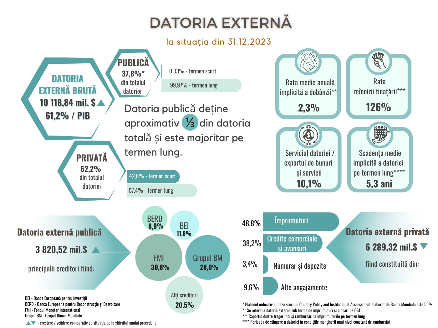 Datoria externă brută a Republicii Moldova a crescut pe parcursul anului 2023 cu 5,7 la sută și a totalizat 10 118,84 mil. USD sau 61,2 la sută raportat la PIB.