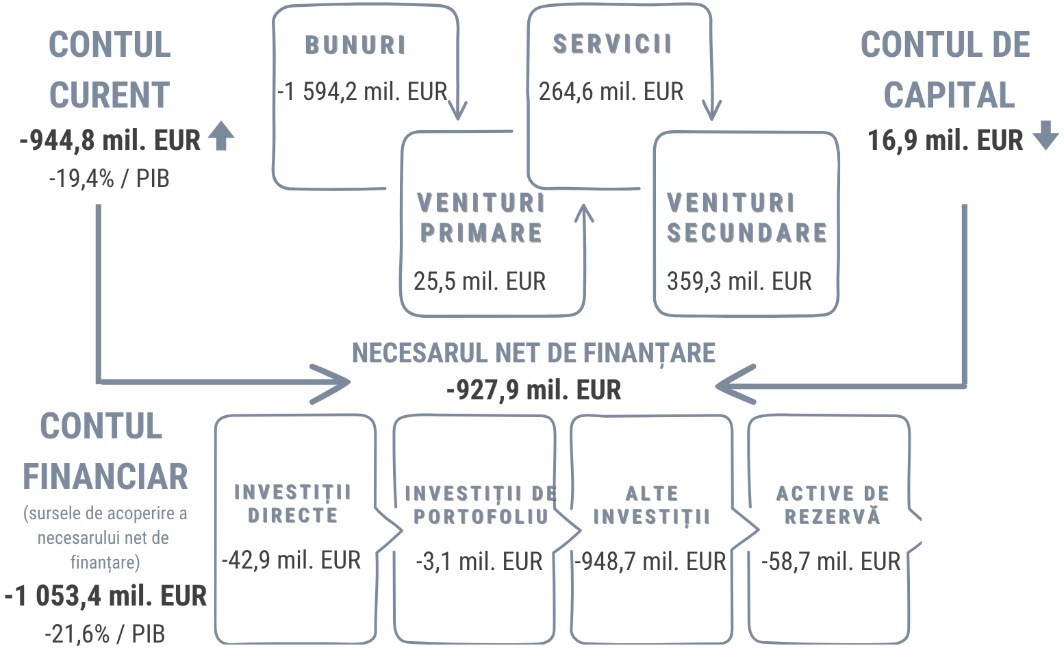 În trimestrul IV 2025, contul financiar al balanței de plăți s-a soldat cu intrări nete de 1 053,4 mil. EUR, care au fost determinate de tranzacțiile nete de micșorare a activelor financiare externe ale rezidenților cu 845,8 mil. EUR, concomitent cu tranzacțiile de majorare netă a pasivelor rezidenților față de nerezidenți cu 207,6 mil. EUR.