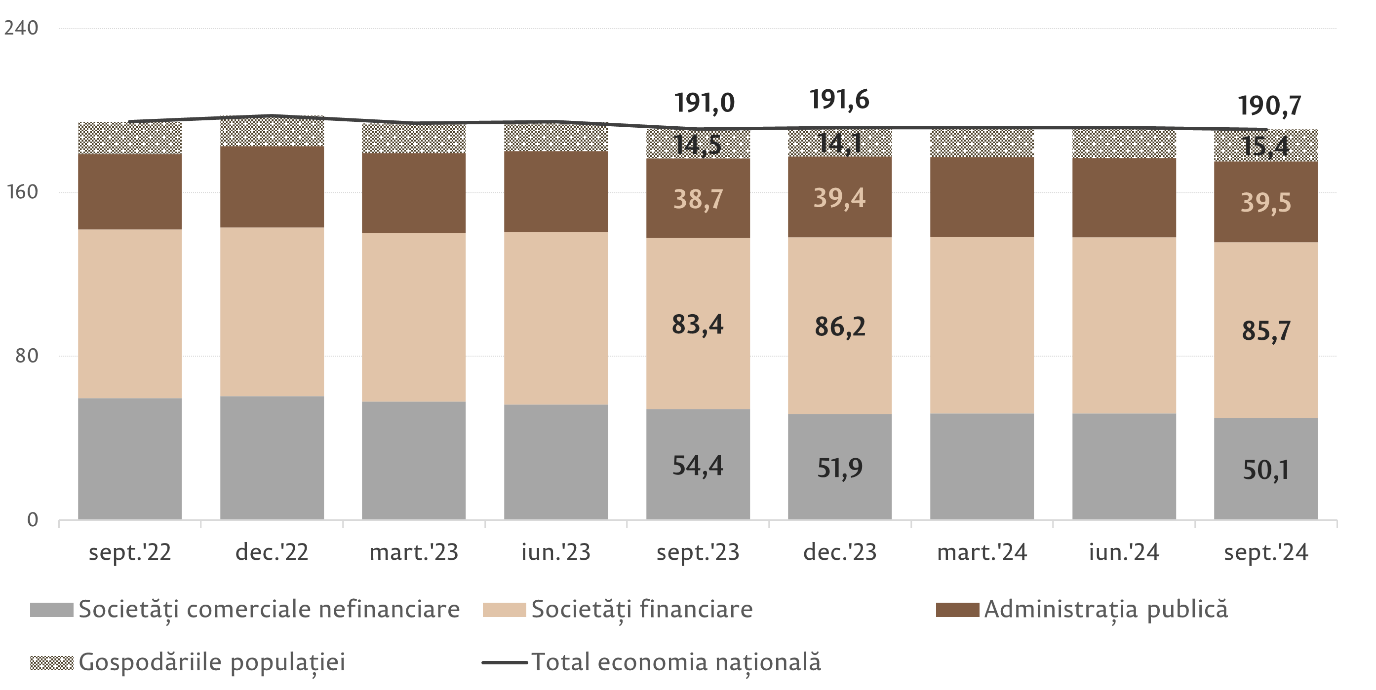 Raportul dintre datoria totală a sectoarelor economiei naționale și PIB, la 30 septembrie 2024, a constituit 190,7 la sută, fiind cu 0,9 puncte procentuale mai mic decât indicatorul respectiv la 31 decembrie 2023 (diagrama 5).