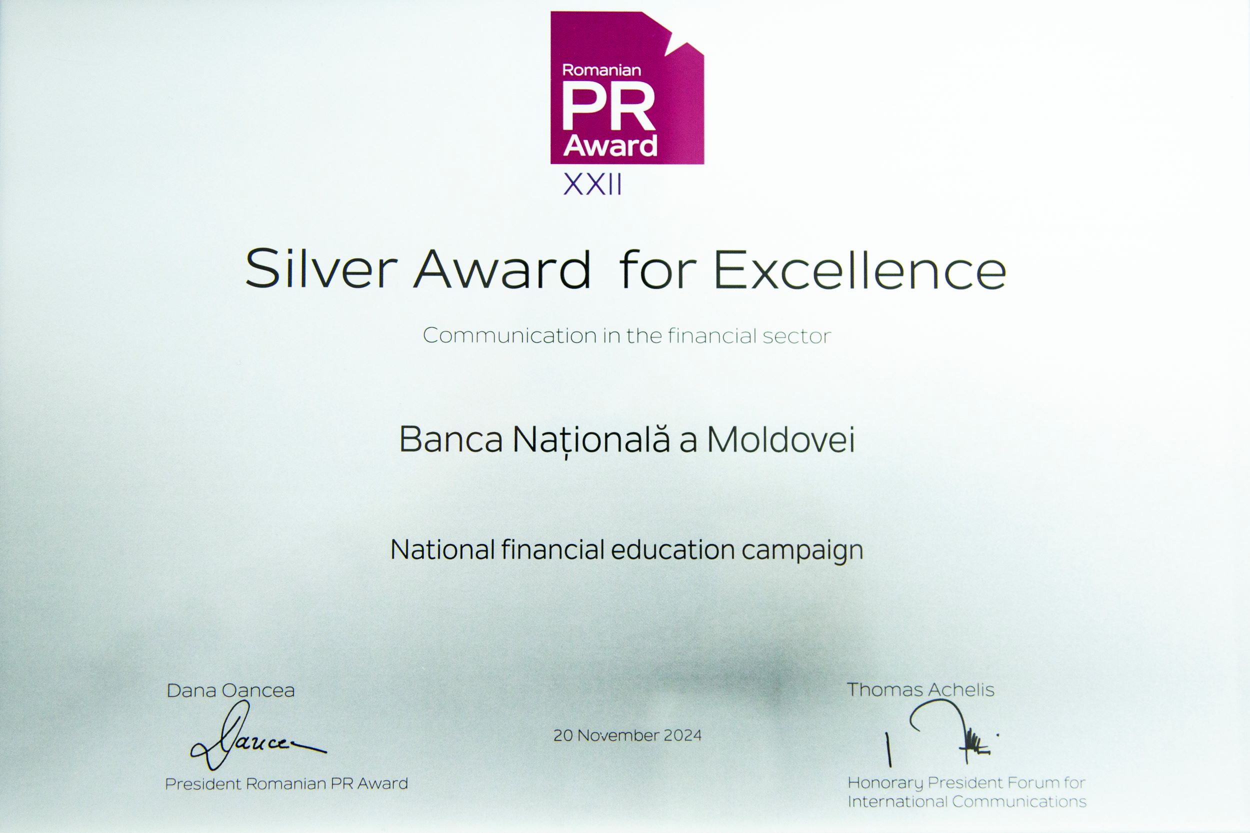 Banca Națională a Moldovei (BNM) a fost distinsă cu premiul Silver în cadrul celei de-a XXII-a ediții a Romanian PR Award, recunoscându-se astfel excelența campaniei naționale de educație financiară „Educație financiară pentru toți”. Această inițiativă, realizată în parteneriat cu USAID prin Programul „Reforme Instituționale și Structurale în Moldova” (MISRA) alături de Centrul Analitic Independent „Expert-Grup”, are drept scop creșterea nivelului de educație financiară în rândul cetățenilor Republicii Moldova.