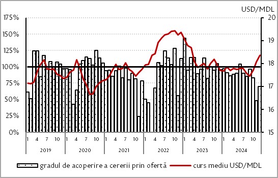 În luna decembrie 2024, gradul de acoperire a cererii nete de valută din partea agenților economici prin oferta netă de valută de la persoanele fizice1 a constituit 69,9% comparativ cu 48,3% în luna noiembrie 2024.