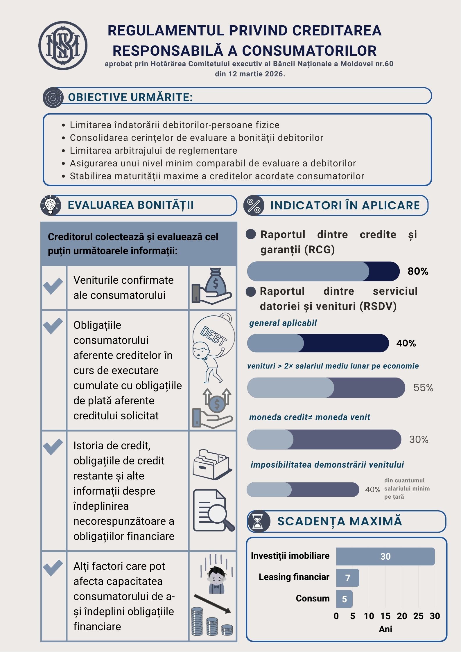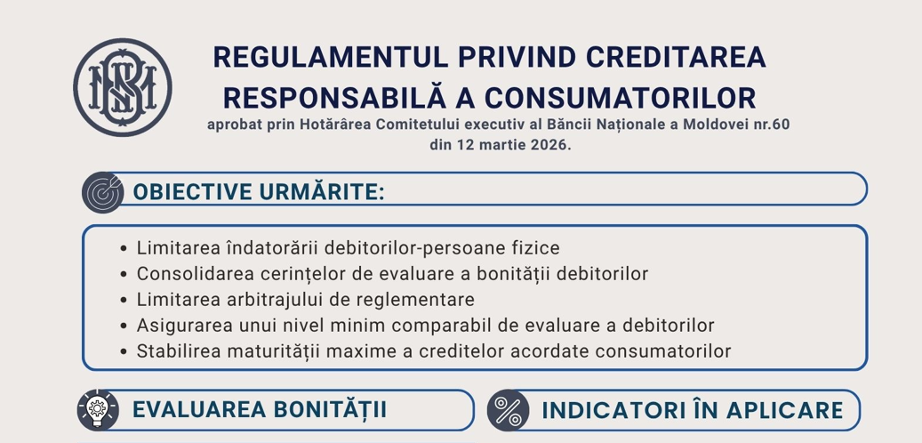 Prin Hotărârea Comitetului executiv al BNM nr.60 din 12 martie 2026 a fost aprobat Regulamentul privind creditarea responsabilă a consumatorilor (Regulamentul nr. 60/2026), aplicabil atât băncilor, cât și organizațiilor de creditare nebancară. Acesta va intra în vigoare la 19 iunie 2026.