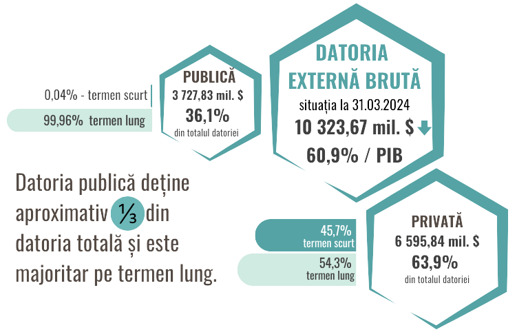Datoria externă publică a reprezentat 36,1 la sută din totalul datoriei externe, însumând 3 727,83 mil. USD (-2,4 la sută comparativ cu finele anului 2022). Datoria externă privată s-a cifrat la 6 595,84 mil. USD, micșorându-se cu 0,7 la sută față de 31.12.2023.