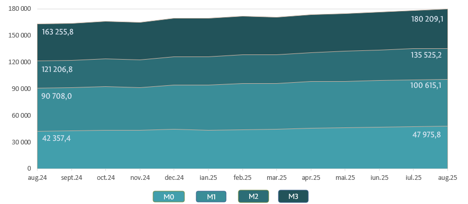 Masa monetară M36 a constituit 180 209,1 milioane lei, fiind în creștere cu 1,1 la sută față de luna iulie 2025 sau cu 10,4 la sută față de perioada similară a anului precedent.