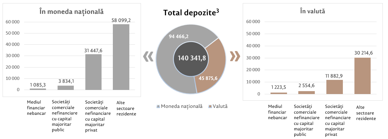 Soldul depozitelor în moneda națională a constituit 94 466,2 milioane lei, în creștere cu 4 916,5 milioane lei comparativ cu luna precedentă, reprezentând o pondere de 67,3 la sută în soldul total al depozitelor. Totodată, soldul depozitelor în valută (recalculat în lei) a constituit 45 875,6 milioane lei, în creștere cu 661,9 milioane lei comparativ cu luna precedentă, având o pondere de 32,7 la sută (diagrama 3).