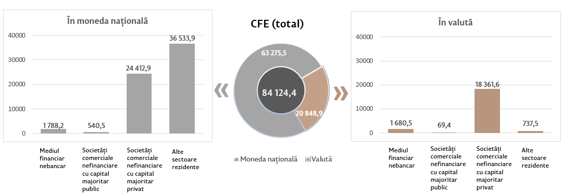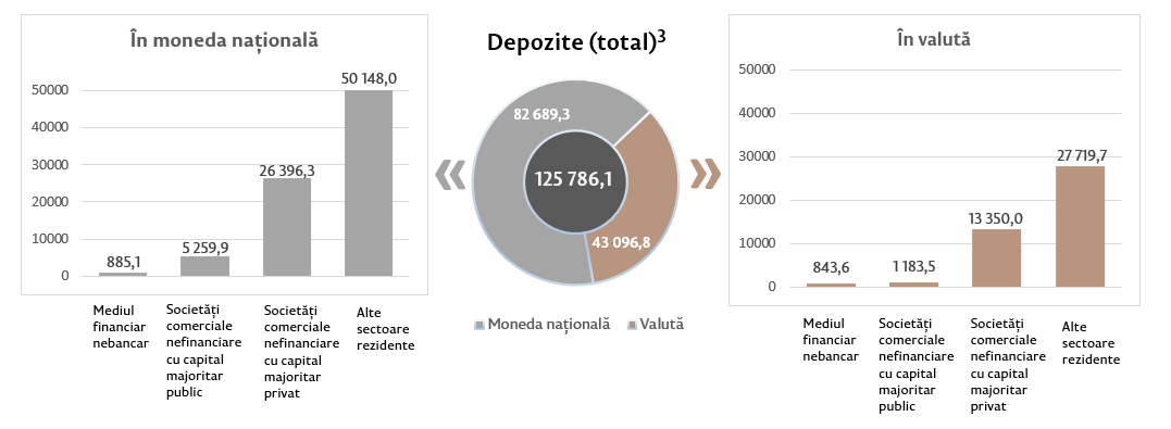 Soldul depozitelor în moneda națională s-a majorat cu 681,2 milioane lei comparativ cu luna precedentă și a constituit 82 689,3 milioane lei, reprezentând o pondere de 65,7 la sută în soldul total al depozitelor. Totodată, soldul depozitelor în valută (recalculat în lei) s-a micșorat cu 388,9 milioane lei comparativ cu luna precedentă, până la nivelul de 43 096,8 milioane lei, având o pondere de 34,3 la sută (diagrama 3).