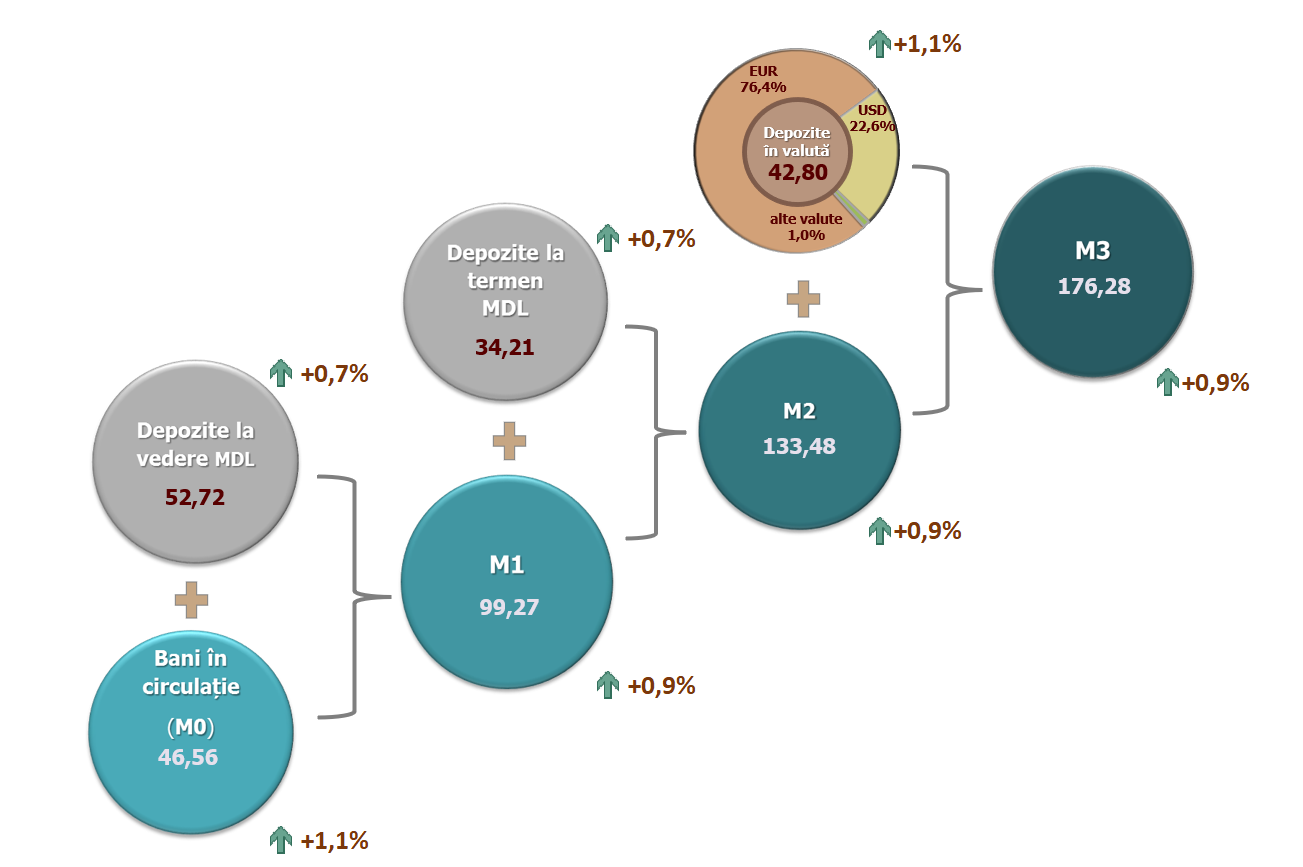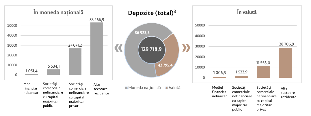 Soldul depozitelor în moneda națională s-a majorat cu 615,8 milioane lei comparativ cu luna precedentă și a constituit 86 923,5 milioane lei, reprezentând o pondere de 67,0 la sută în soldul total al depozitelor. Totodată, soldul depozitelor în valută (recalculat în lei) s-a majorat cu 452,2 milioane lei comparativ cu luna precedentă, până la nivelul de 42 795,4 milioane lei, având o pondere de 33,0 la sută (diagrama 3).