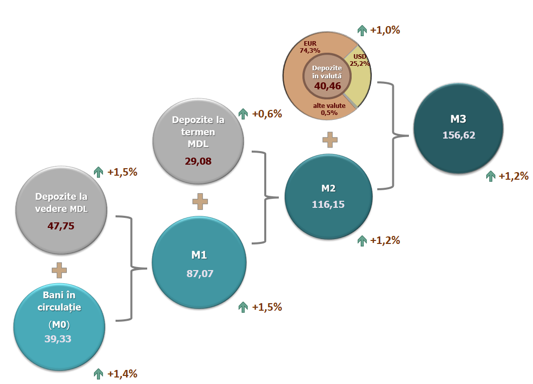 6. Masa monetară M3 include masa monetară M2 și depozitele în valută exprimate în lei moldovenești ale rezidenților.