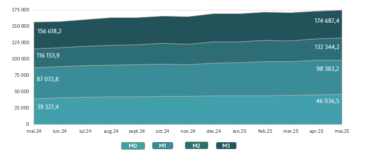 Masa monetară M36 s-a majorat cu 1 399,1 milioane lei sau cu 0,8 la sută față de luna aprilie 2025 și a constituit 174 687,4 milioane lei, în creștere cu 11,5 la sută față de perioada similară a anului precedent.