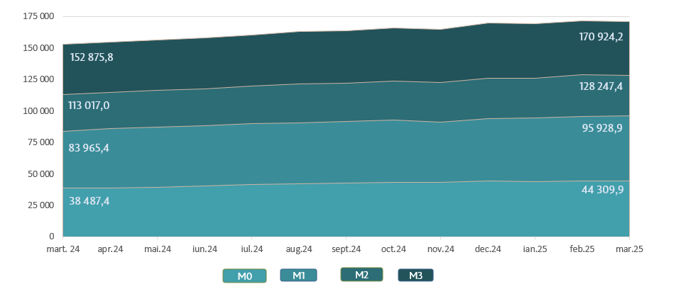 Masa monetară M36 s-a micșorat cu 851,4 milioane lei sau cu 0,5 la sută față de luna februarie 2025 și a constituit 170 924,2 milioane lei, în creștere cu 11,8 la sută față de perioada similară a anului precedent.