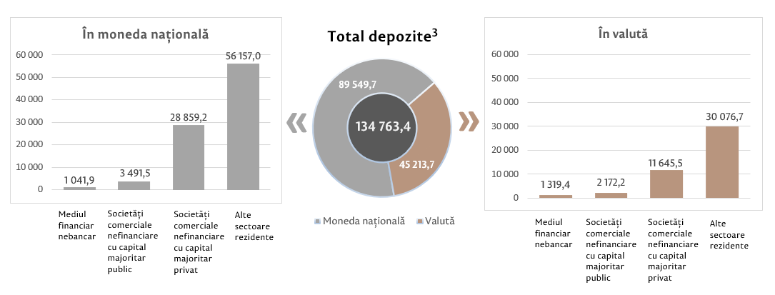 Soldul depozitelor în moneda națională a constituit 89 549,7 milioane lei, în creștere cu 767,2 milioane lei comparativ cu luna precedentă, reprezentând o pondere de 66,4 la sută în soldul total al depozitelor. Totodată, soldul depozitelor în valută (recalculat în lei) a constituit 45 213,7 milioane lei, în creștere cu 149,7 milioane lei comparativ cu luna precedentă, având o pondere de 33,6 la sută (diagrama 3).