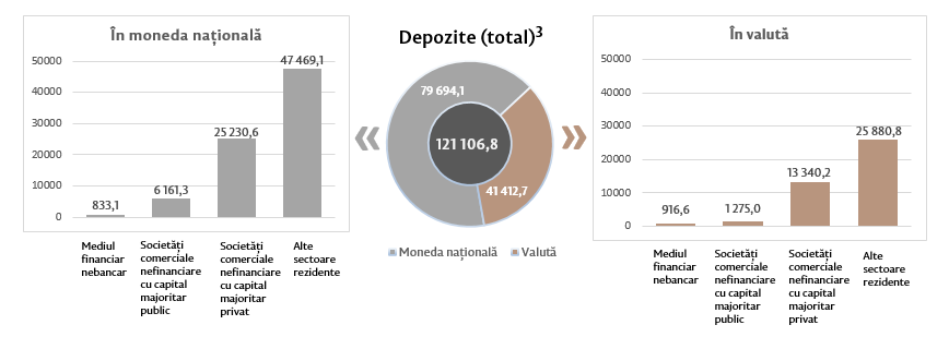 Soldul depozitelor în moneda națională s-a majorat cu 844,8 milioane lei comparativ cu luna precedentă și a constituit 79 694,1 milioane lei, reprezentând o pondere de 65,8 la sută în soldul total al depozitelor. Totodată, soldul depozitelor în valută (recalculat în lei) s-a micșorat cu 636,4 milioane lei comparativ cu luna precedentă, până la nivelul de 41 412,7 milioane lei, având o pondere de 34,2 la sută (diagrama 3).