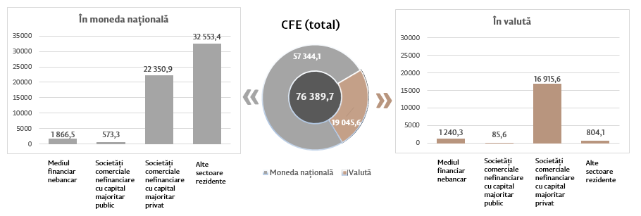 Soldul cererilor față de economie6 (diagrama 4) a constituit 76 389,7 milioane lei, majorându-se în luna septembrie 2024 comparativ cu luna august 2024 cu 1 977,7 milioane lei (+2,7 la sută), ca urmare a creșterii cererilor față de economie în moneda națională cu 1 724,8 milioane lei (+3,1 la sută) și a creșterii cererilor față de economie în valută (exprimate în MDL) cu 252,9 milioane lei (+1,3 la sută).