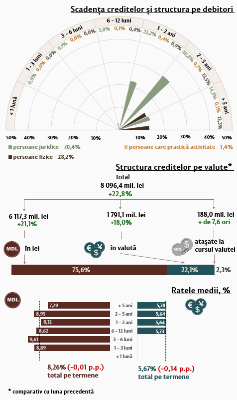 Rata medie nominală la creditele noi acordate în moneda națională s-a diminuat cu 0,01 puncte procentuale (p.p.) comparativ cu luna precedentă și a constituit 8,26 la sută, iar rata medie la cele în valută s-a diminuat cu 0,14 p.p., constituind 5,67 la sută.