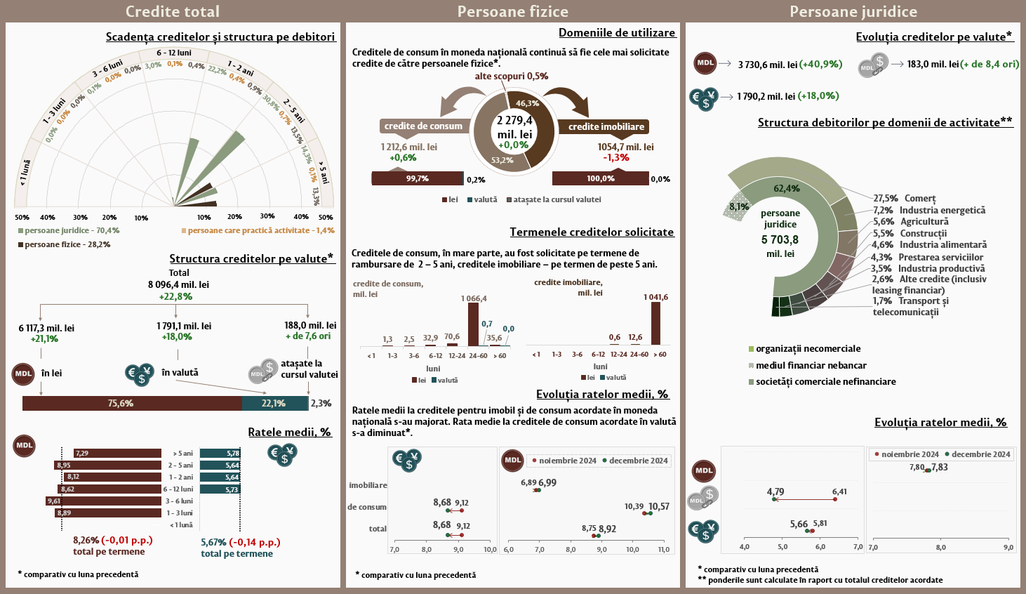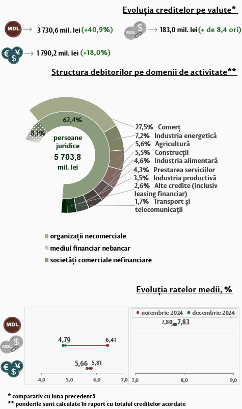 În luna decembrie 2024, creditele noi1 acordate (Infografic 1) au constituit 8 096,4 milioane lei, în creștere cu 22,8 la sută față de luna noiembrie 2024. Partea majoră (75,6 la sută) reprezintă creditele în moneda națională, care au constituit 6 117,3 milioane lei, în creștere cu 21,1 la sută față de luna precedentă.