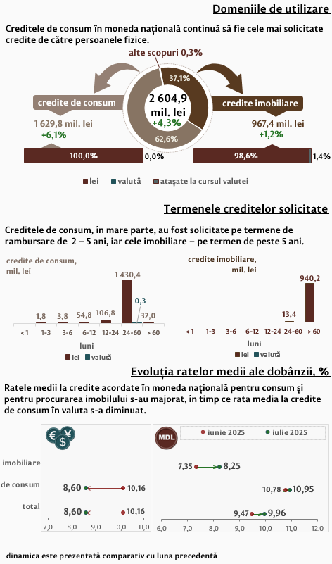 Persoanele fizice în luna iulie 2025 au contractat credite în volum de 2 604,9 milioane lei, în creștere cu 4,3 la sută față de luna precedentă, partea majoră (62,6 la sută) fiind acordată pentru consum (Infografic 2). Majoritatea creditelor de consum acordate persoanelor fizice (1 430,4 milioane lei) au fost acordate în moneda națională pe termene de la 2 până la 5 ani.