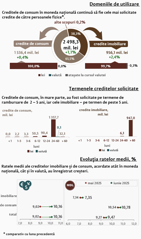 Persoanele fizice în luna iunie 2025 au contractat credite în volum de 2 498,3 milioane lei, în creștere cu 1,1 la sută față de luna precedentă, partea majoră (61,5 la sută) fiind acordată pentru consum (Infografic 2). Majoritatea creditelor de consum acordate persoanelor fizice (1 357,7 milioane lei) au fost acordate în moneda națională pe termene de la 2 până la 5 ani.
