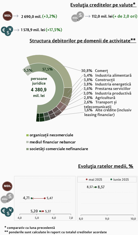 Partea majoră (91,3 la sută) din totalul creditelor noi acordate persoanelor juridice a fost contractată de către societățile comerciale nefinanciare, acestea reprezentând 57,5 la sută din totalul creditelor noi acordate în luna iunie 2025.