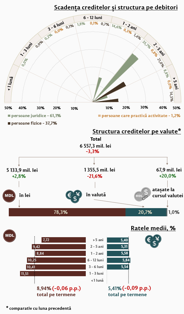 Rata medie la creditele de consum acordate în moneda națională s-a diminuat cu 0,10 p.p. și a constituit 10,54 la sută. Rata medie la creditele imobiliare acordate în moneda națională s-a majorat cu 0,04 p.p., constituind 7,14 la sută.