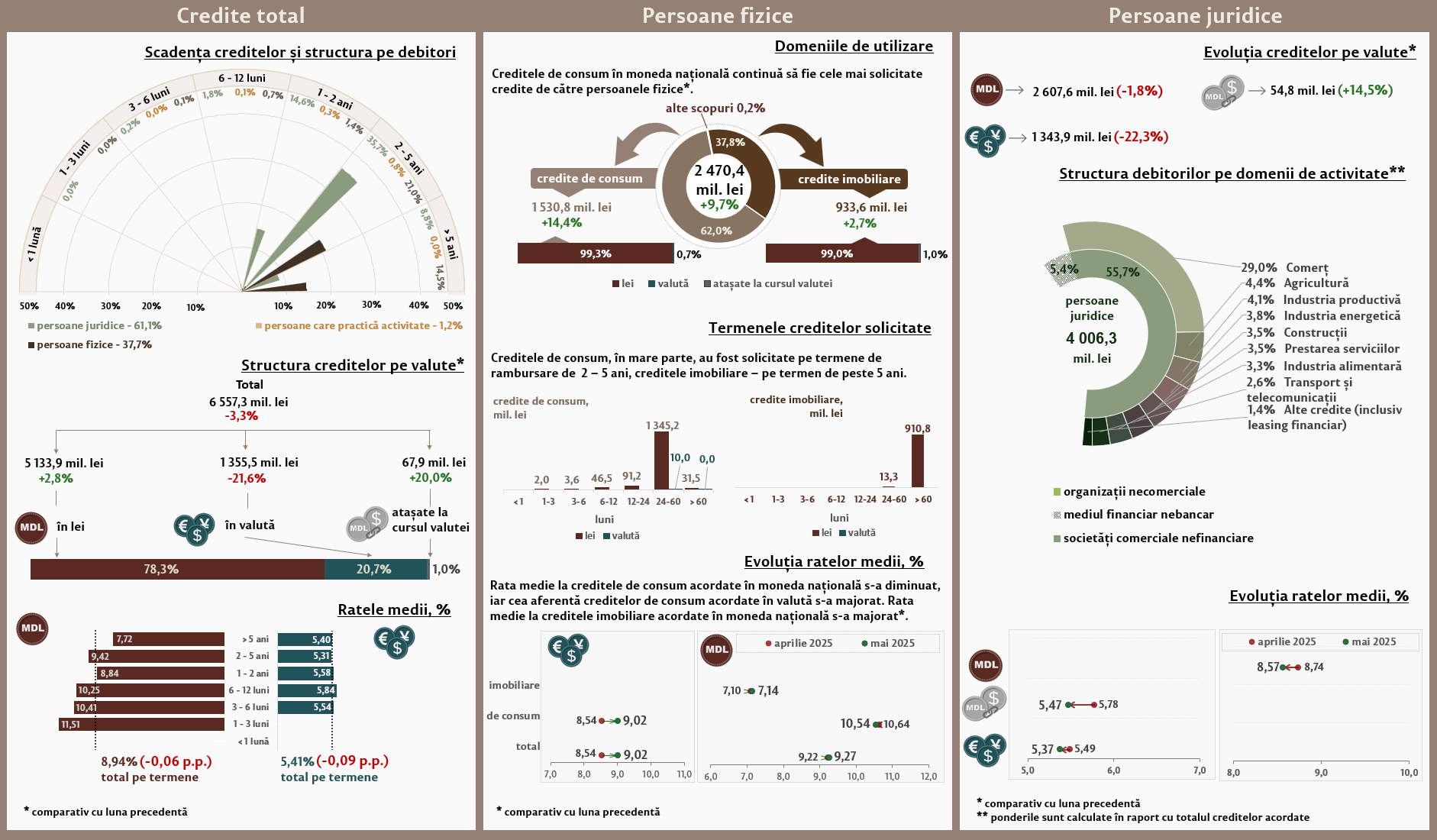 În luna mai 2025, creditele noi1 acordate (Infografic 1) au constituit 6 557,3 milioane lei, în descreștere cu 3,3 la sută față de luna aprilie 2025. Partea majoră (78,3 la sută) reprezintă creditele în moneda națională, care au constituit 5 133,9 milioane lei, în creștere cu 2,8 la sută față de luna precedentă.