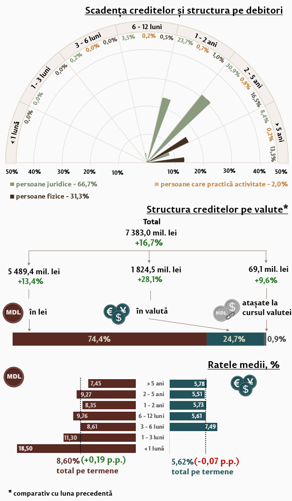 Rata medie la creditele de consum acordate în moneda națională s-a majorat cu 0,04 p.p. și a constituit 10,66 la sută. Rata medie la creditele imobiliare acordate în moneda națională s-a majorat cu 0,14 p.p., constituind 7,12 la sută.
