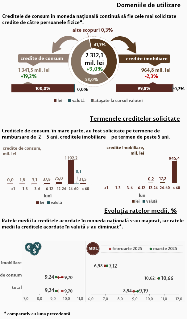 Persoanele fizice în luna martie 2025 au contractat credite în volum de 2 312,1 milioane lei (Infografic 2), în creștere cu 9,0 la sută față de luna precedentă, partea majoră (58,0 la sută) fiind acordată pentru consum. Majoritatea creditelor de consum acordate persoanelor fizice (1 192,2 milioane lei) au fost acordate în moneda națională pe termene de la 2 până la 5 ani.