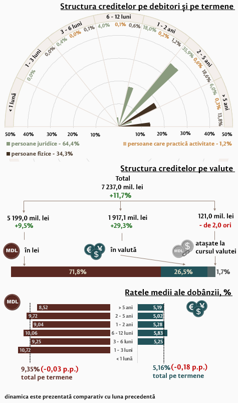 Rata medie la creditele de consum acordate în moneda națională s-a diminuat cu 0,02 p.p. și a constituit 11,07 la sută. Rata medie la creditele imobiliare acordate în moneda națională s-a majorat cu 0,05 p.p., constituind 8,21 la sută.