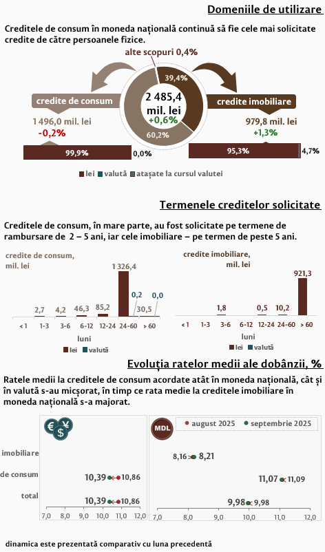 Persoanele fizice în luna septembrie 2025 au contractat credite în volum de 2 485,4 milioane lei, în creștere cu 0,6 la sută față de luna precedentă, partea majoră (60,2 la sută) fiind acordată pentru consum (Infografic 2). Majoritatea creditelor de consum acordate persoanelor fizice (1 326,4 milioane lei) au fost acordate în moneda națională pe termene de la 2 până la 5 ani.