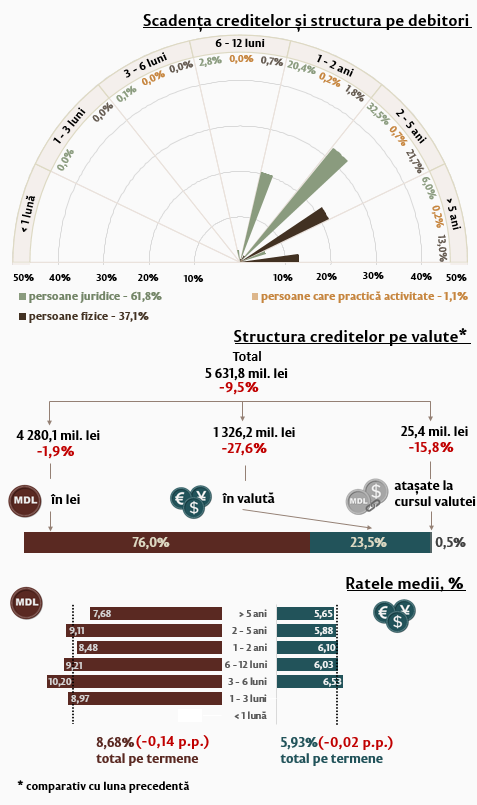 Rata medie la creditele de consum acordate în moneda națională s-a diminuat cu 0,27 puncte procentuale și a constituit 10,35 la sută. Rata medie la creditele pentru procurarea imobilului acordate în moneda națională s-a majorat cu 0,09 puncte procentuale, constituind 7,47 la sută.