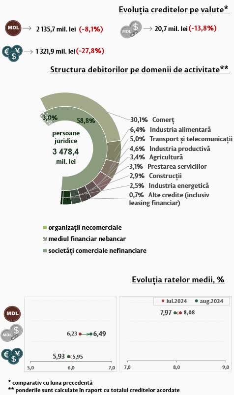 În luna august 2024, creditele noi1 acordate (Infografic 1) au constituit 5 631,8 milioane lei, în descreștere cu 9,5 la sută față de luna iulie 2024. Partea majoră (76,0 la sută) reprezintă creditele în moneda națională, care au constituit 4 280,1 milioane lei, în descreștere cu 1,9 la sută față de luna precedentă.