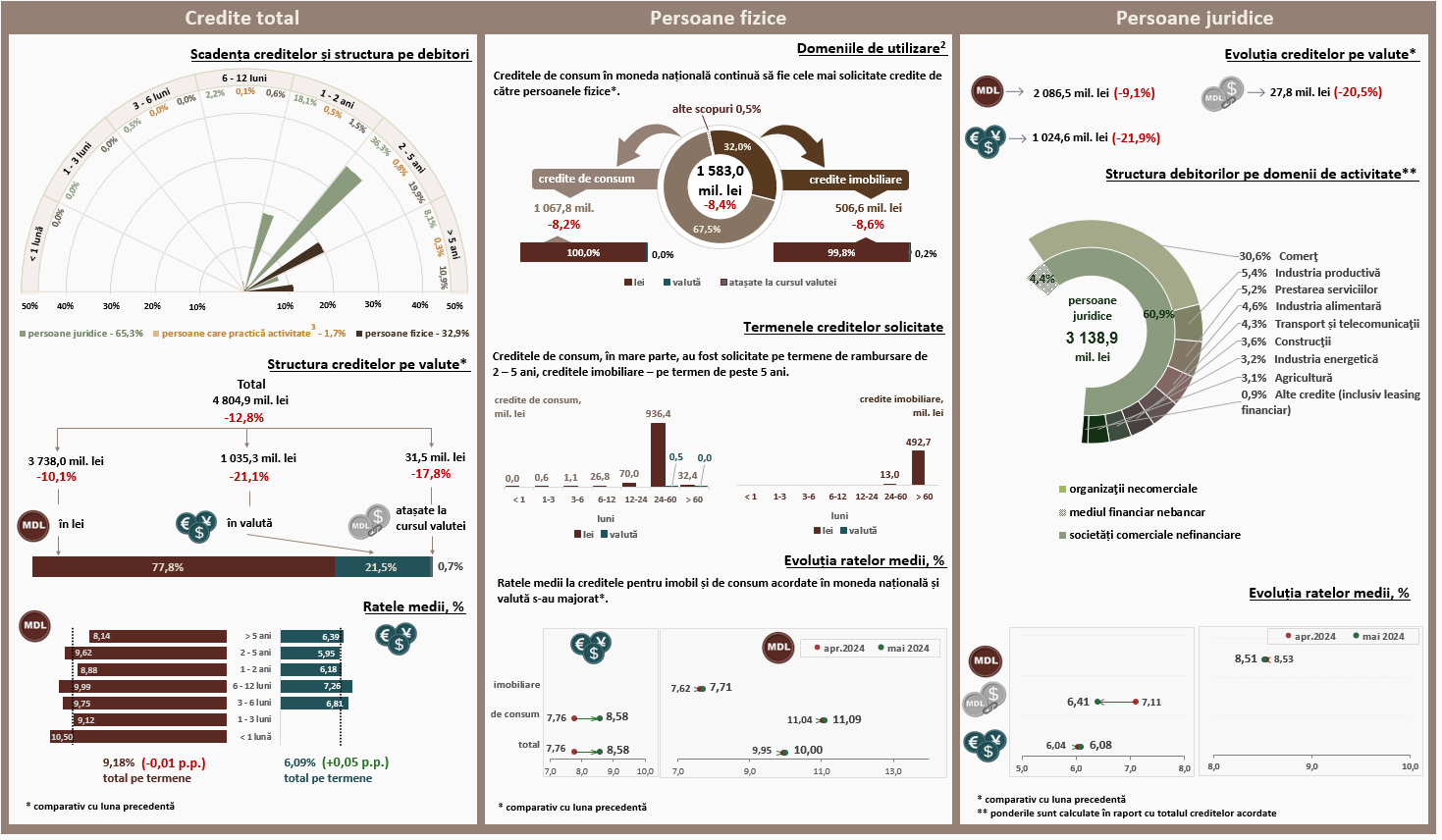 În luna mai 2024, creditele noi1 acordate (Infografic 1) au constituit 4 804,9 milioane lei, în descreștere cu 12,8 la sută față de luna aprilie 2024. Partea majoră (77,8 la sută) reprezintă creditele în moneda națională, care au constituit 3 738,0 milioane lei, în descreștere cu 10,1 la sută față de luna precedentă.